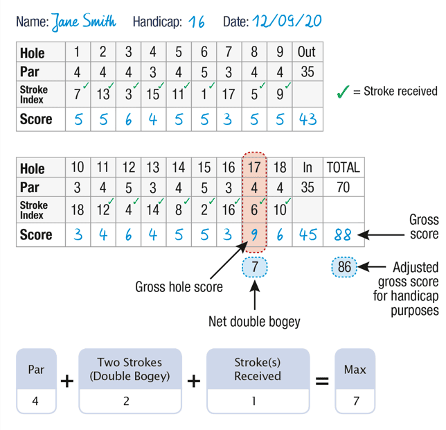 equal to double bogey + any handicap strokes you receive based on your Course Handicap™.